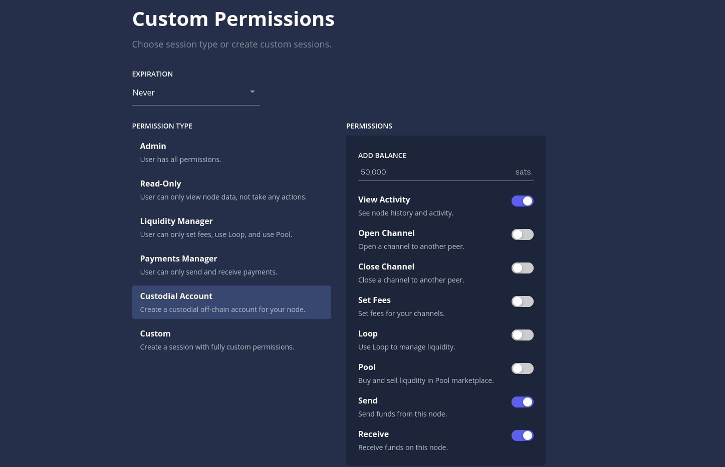 More conveniently, an account can also be created from the litd user interface. Create a new session under "Lightning Node Connect," give it a name and select "Custom" under permissions, then choose "Custodial Account" in the next window.