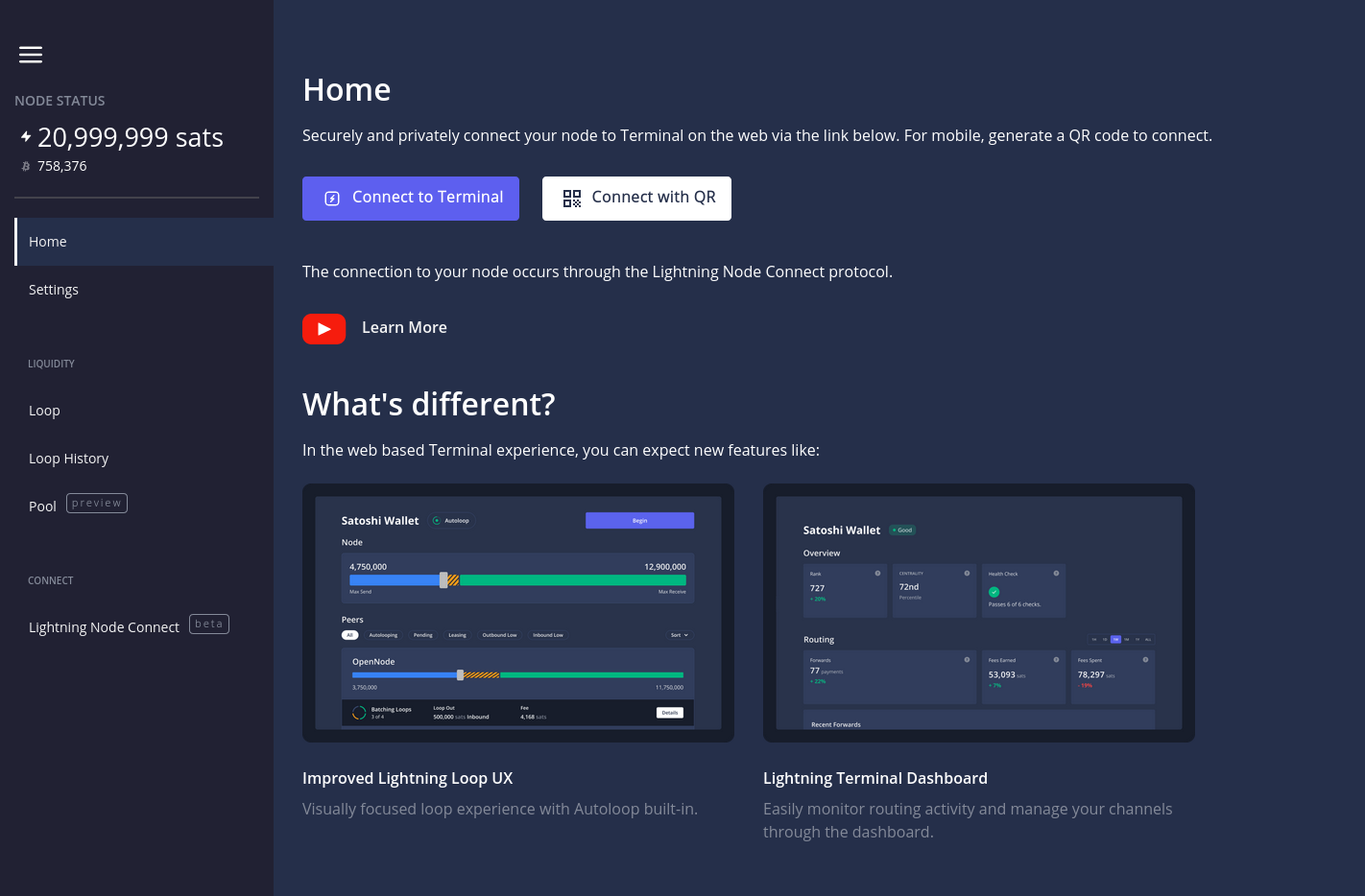 You're now connected to Lightning Terminal! Read more about [Recommended Channels](https://docs.lightning.engineering/lightning-network-tools/lightning-terminal/recommended-channels), [Health Checks](https://docs.lightning.engineering/lightning-network-tools/lightning-terminal/health-checks), and [how to open channels to the Lightning Network](https://docs.lightning.engineering/lightning-network-tools/lightning-terminal/opening-channels).