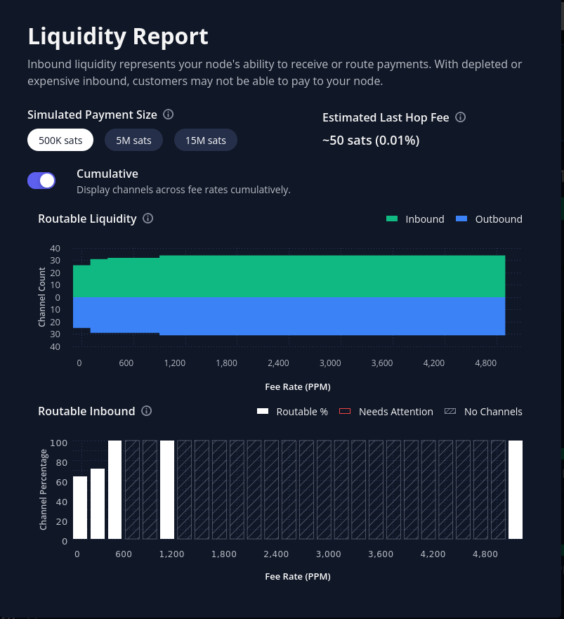 The “Routable Liquidity” graph shows how many channels you can get paid through at several fee levels. It can be displayed as an ordinary or cumulative histogram.