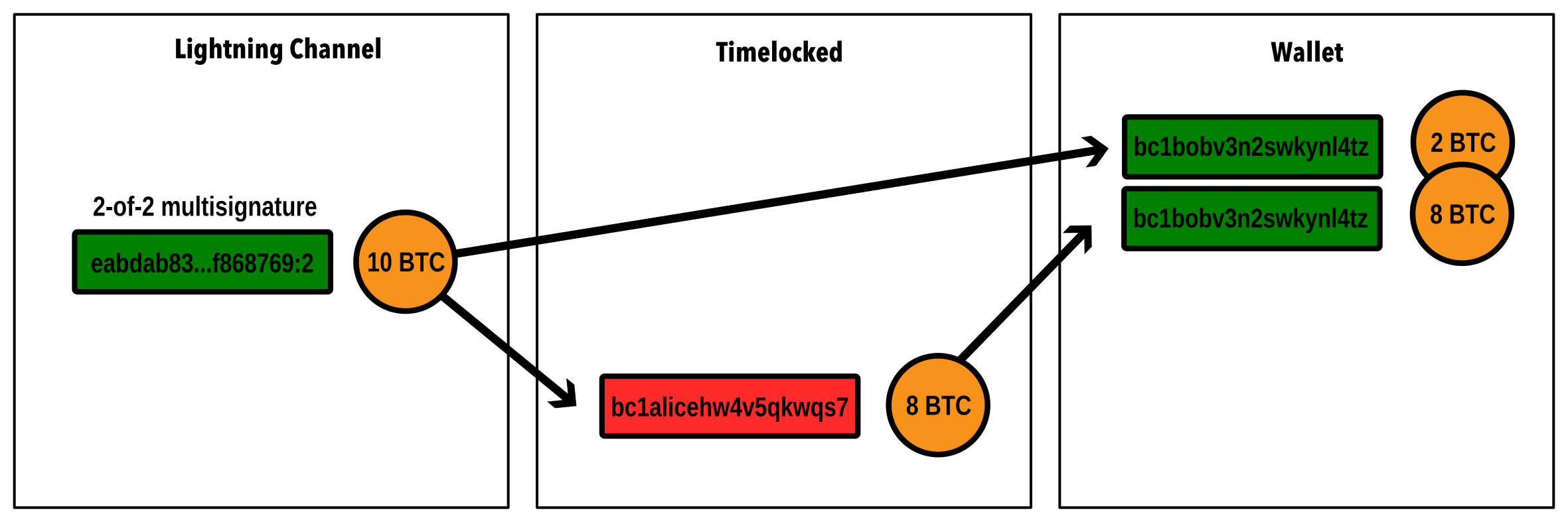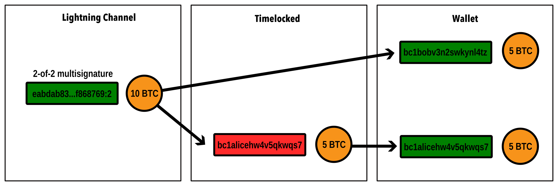 <figure><img src="https://2545062540-files.gitbook.io/~/files/v0/b/gitbook-x-prod.appspot.com/o/spaces%2F-MIzyiDsFtJBYVyhr1nT%2Fuploads%2Fgit-blob-a30f7f701a62fea7ec0f4e94f8d1091b1e9ca532%2Fcommitment_1.png?alt=media" alt=""><figcaption><p>In a regular unilateral channel closure, Alice, the initiator, has to wait to retrieve her side of the channel, while Bob is able to spend his as soon as the commitment transaction is confirmed.</p></figcaption></figure>