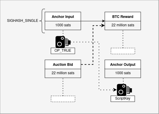 As the anchor input cannot be double-spent on the Bitcoin blockchain, only the winner of this auction can claim the Taproot Asset as theirs, while all competing transactions become invalid once a bid is confirmed on the blockchain.